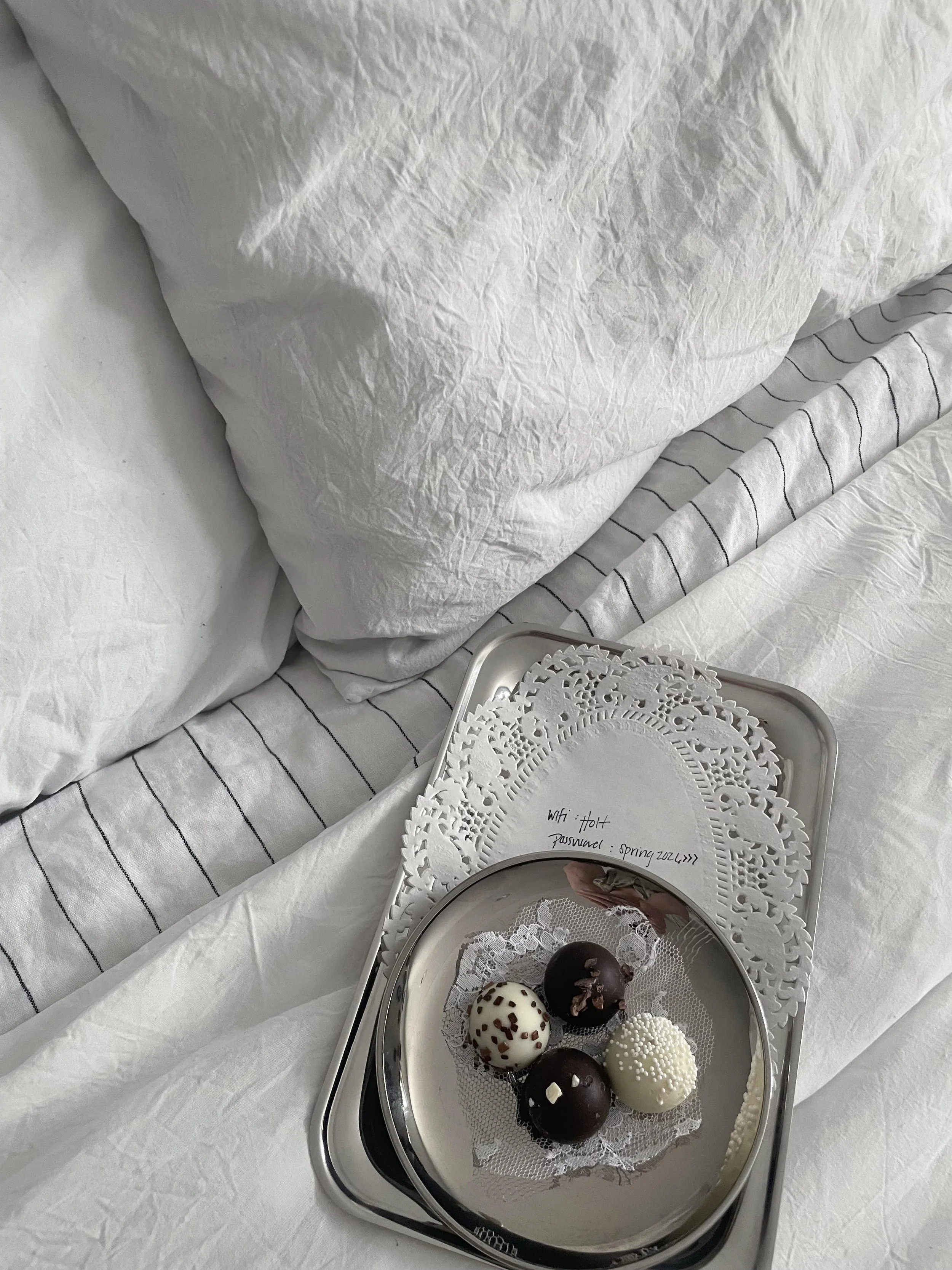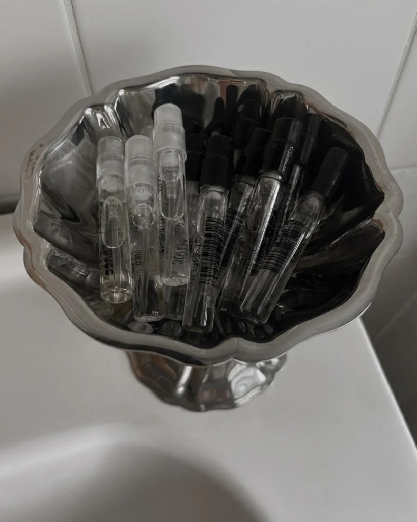 A clean bathroom stocked with toiletry essentials (makeup wipes, shampoo, conditioner, hand soaps, extra toothbrushes and toothpaste, fresh towels, etc.) is arguably the most important preparation. As the traveling party it’s hard to pack all toiletries for a short stay. We like to save sample perfumes for guests to try in a coupe glass or sorbet dish-so chic and kind of fun for guests!