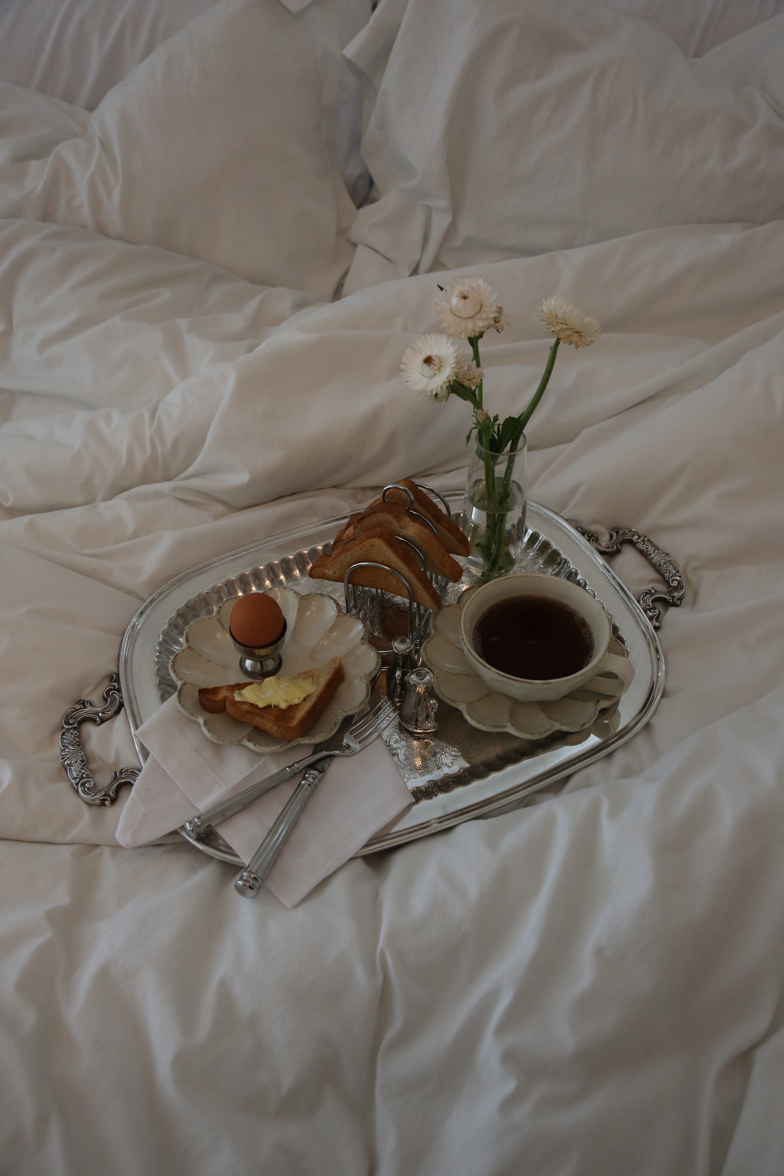 A curated breakfast on a silver tray, soft-boiled eggs, crispy toast and a beautiful cup of Tea. This setup is the ultimate way to pamper a guest, offering a slow, indulgent start to the day. With a touch of fresh blooms and a few gourmet details, it turns the morning into a luxury retreat.