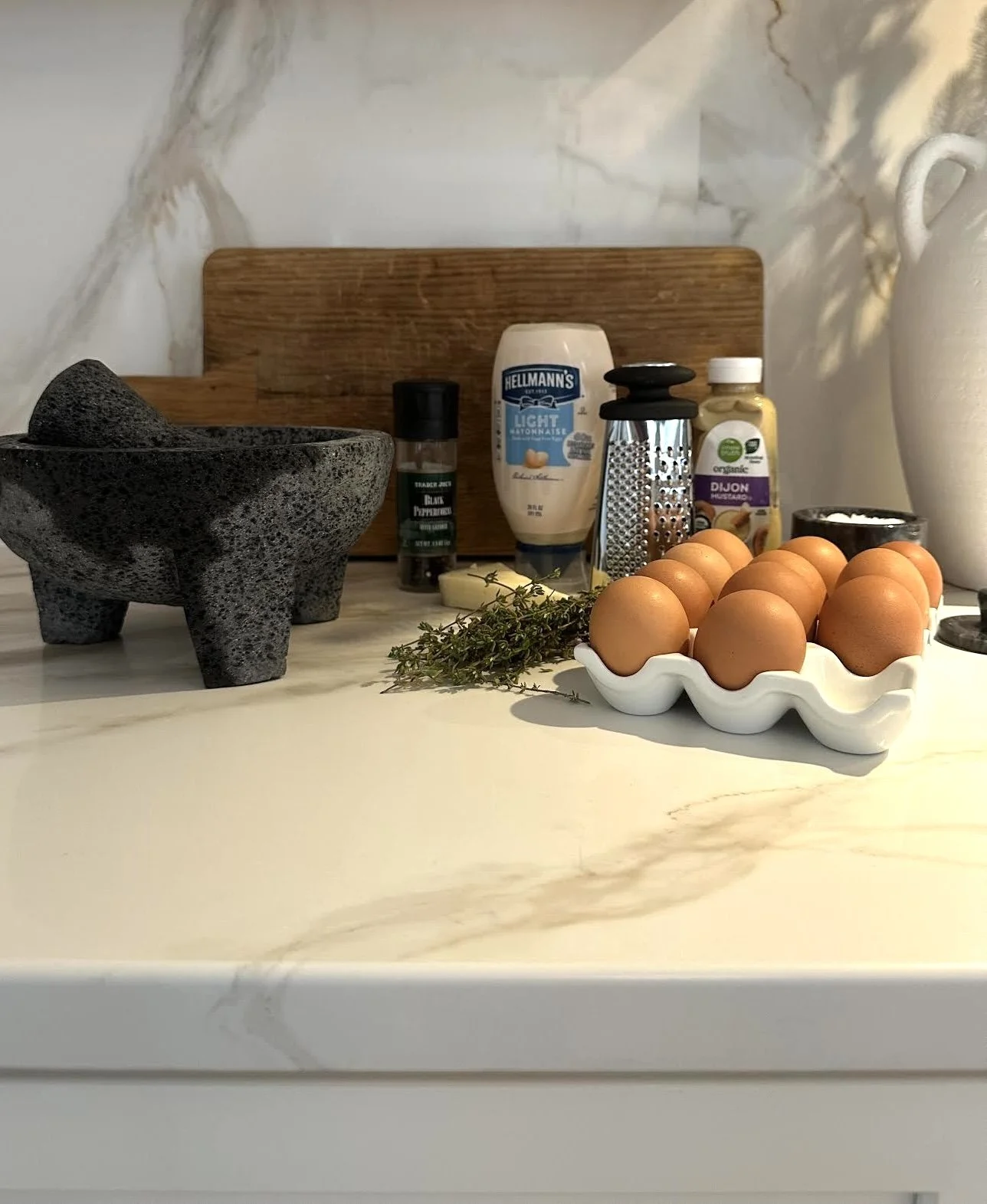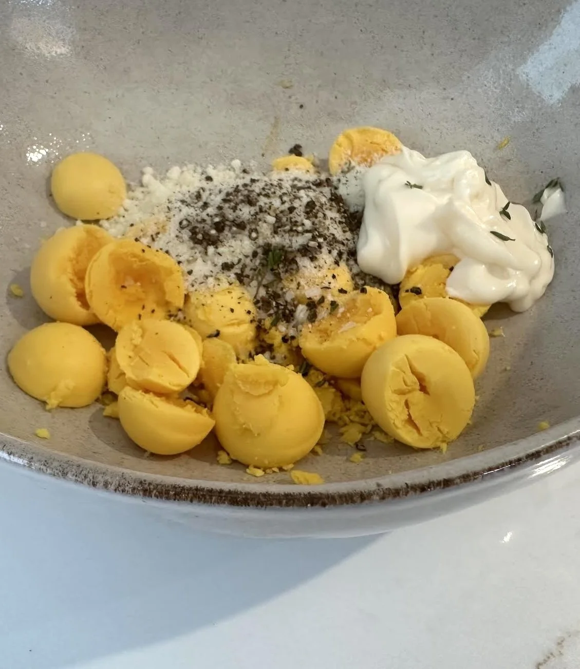 Begin by hard boiling your eggs in simmering water for about 12 minutes, then submerging them in an ice bath to stop the cooking process. You’ll need to peel off the shells and dry throughly. next, carefully slice the eggs in half vertically, wiping your knife with each cut to keep egg white clean. add the yolks to a small bowl or food processor and add remaining ingredients to make the filling. You will either need pipe or spoon them back into the egg white portion. Garnish the top with grated pecorino and fresh thyme then serve.