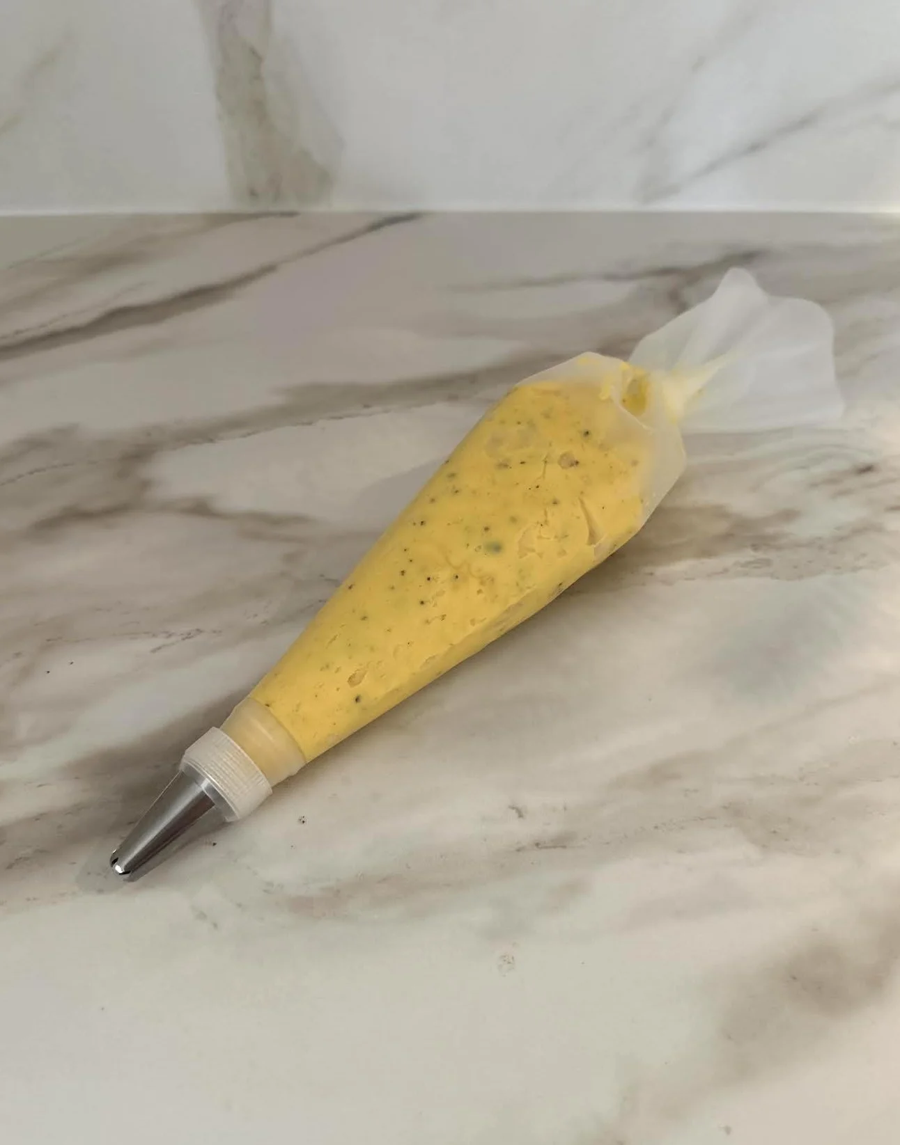 When ready to serve, remove platter of egg whites and piping bag from fridge. Gently pipe filling to fill up each egg white center.