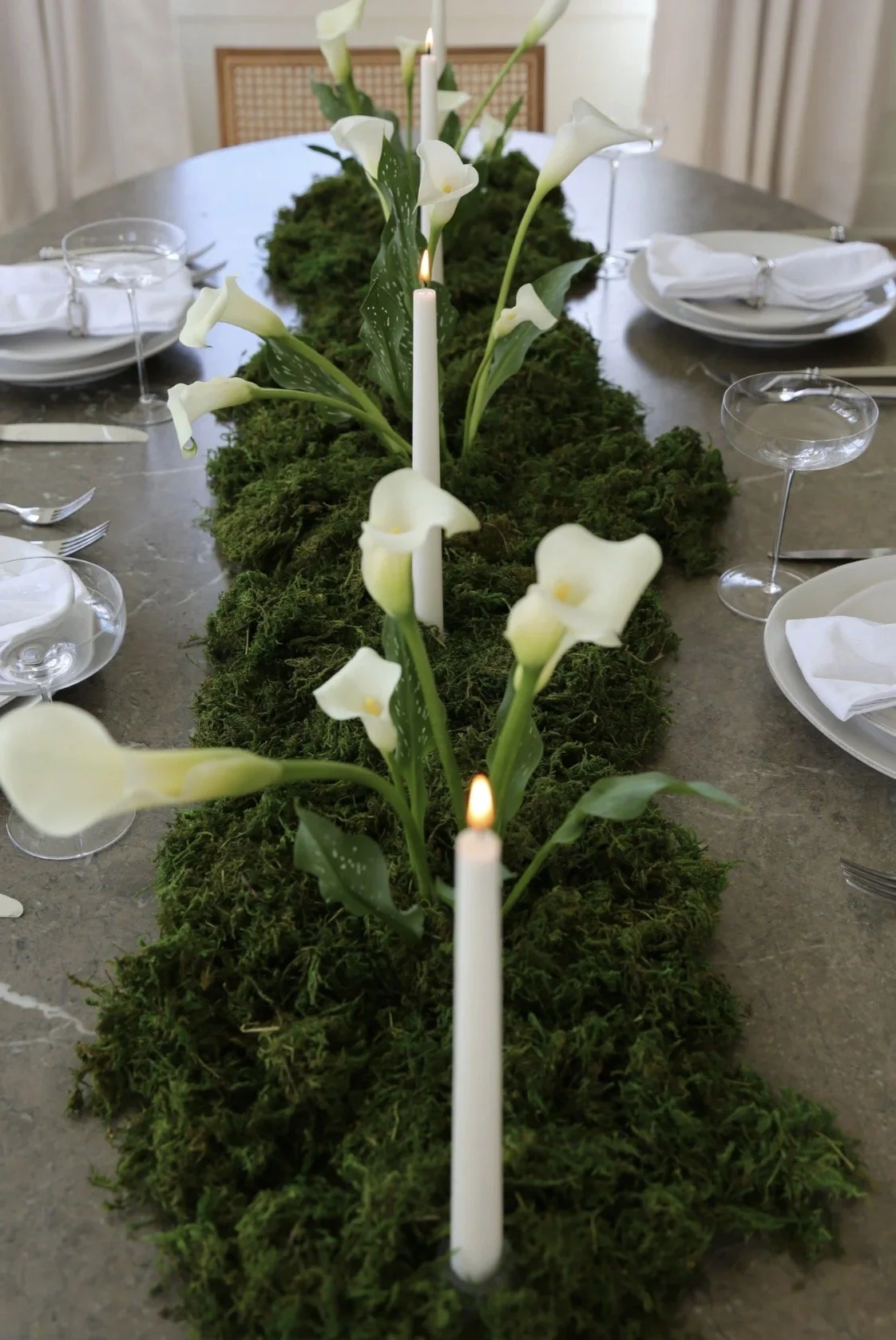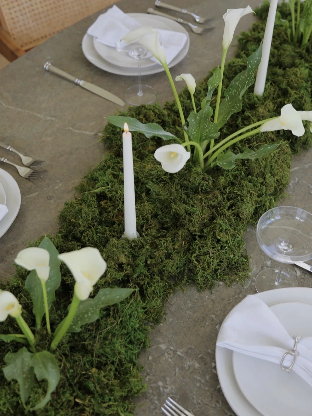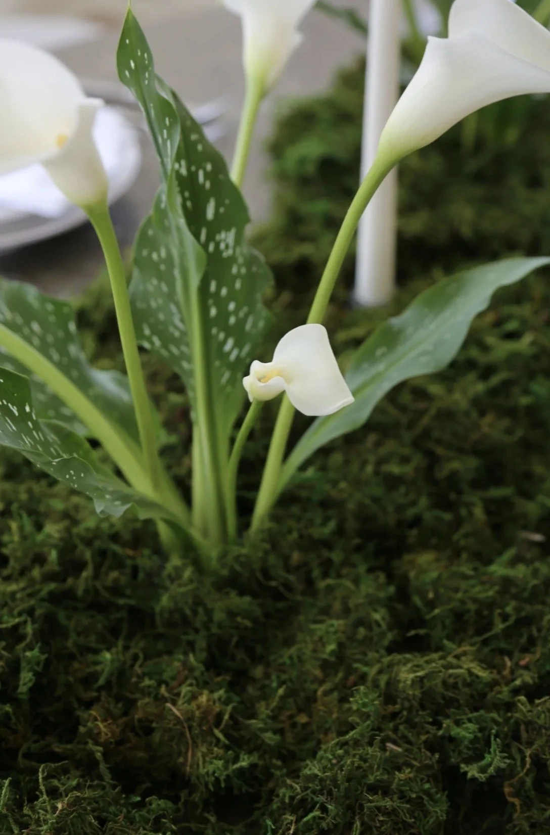 The centerpiece is not a traditional arrangement, but a landscape of rich, deep green preserved moss, creating a soft, textural canvas. Weaving through its path are the pure, architectural forms of calla lilies.