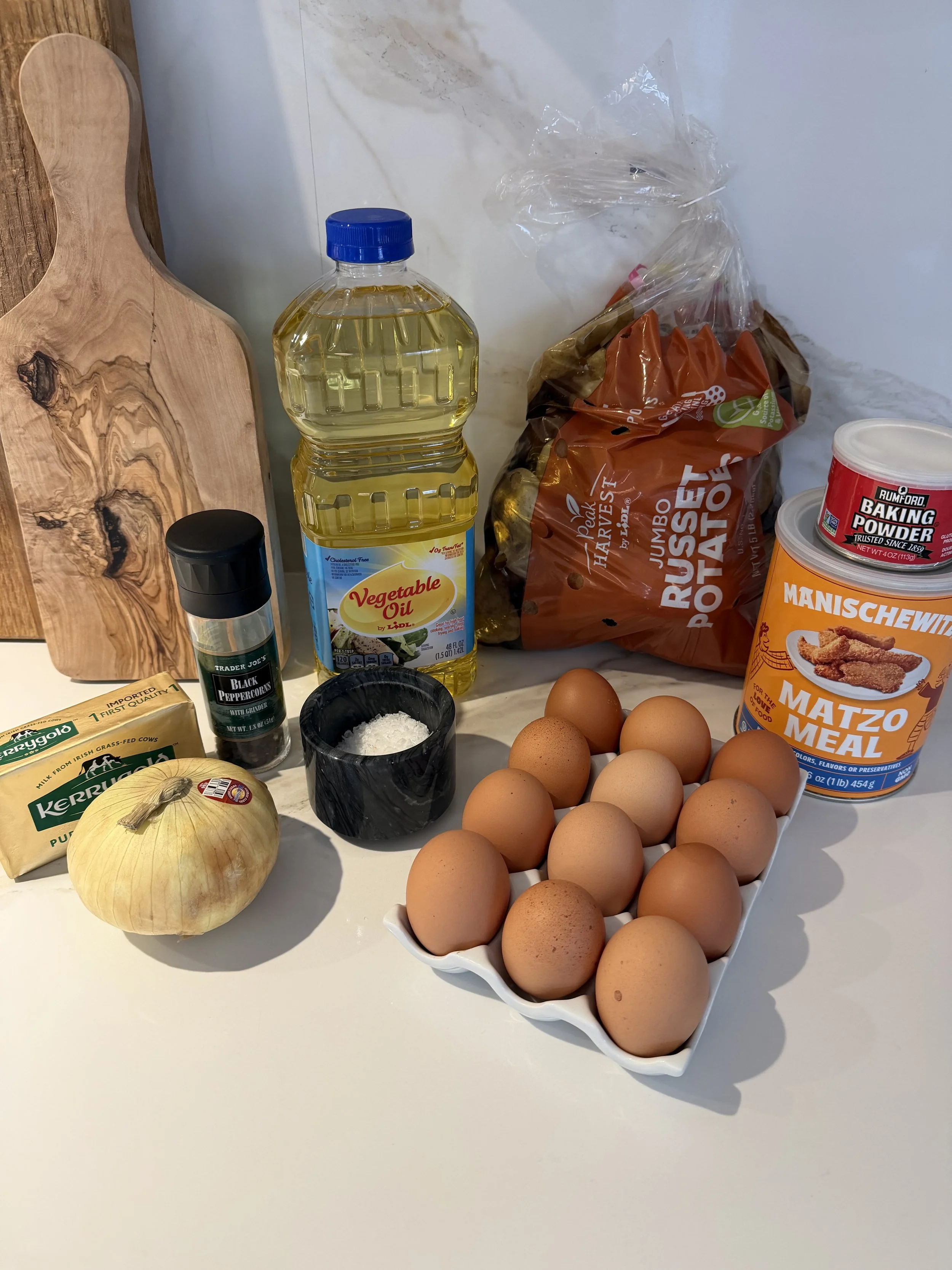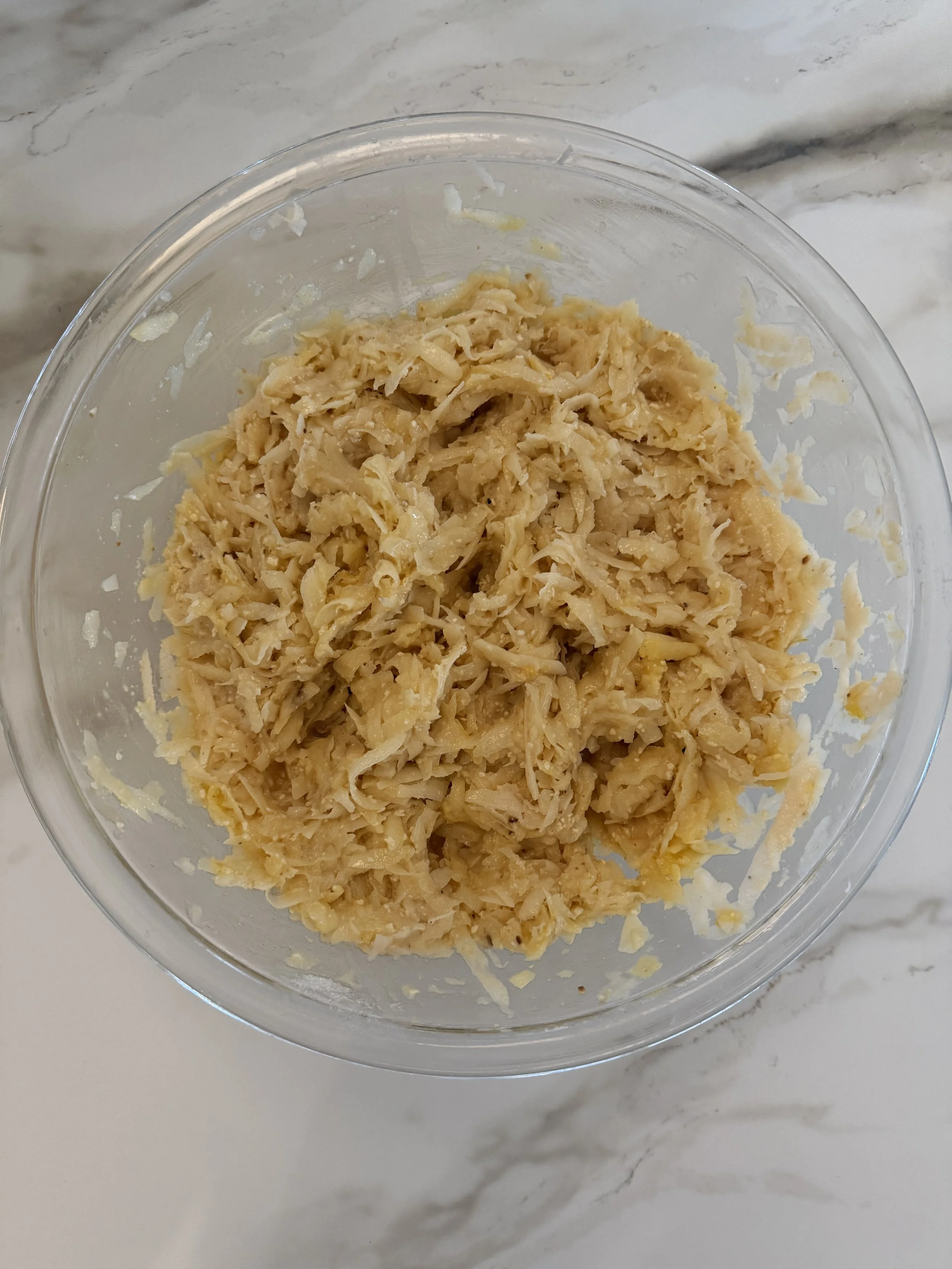 Combine the potatoes and onion with the starch, add eggs and mix in the remaining dry ingredients.