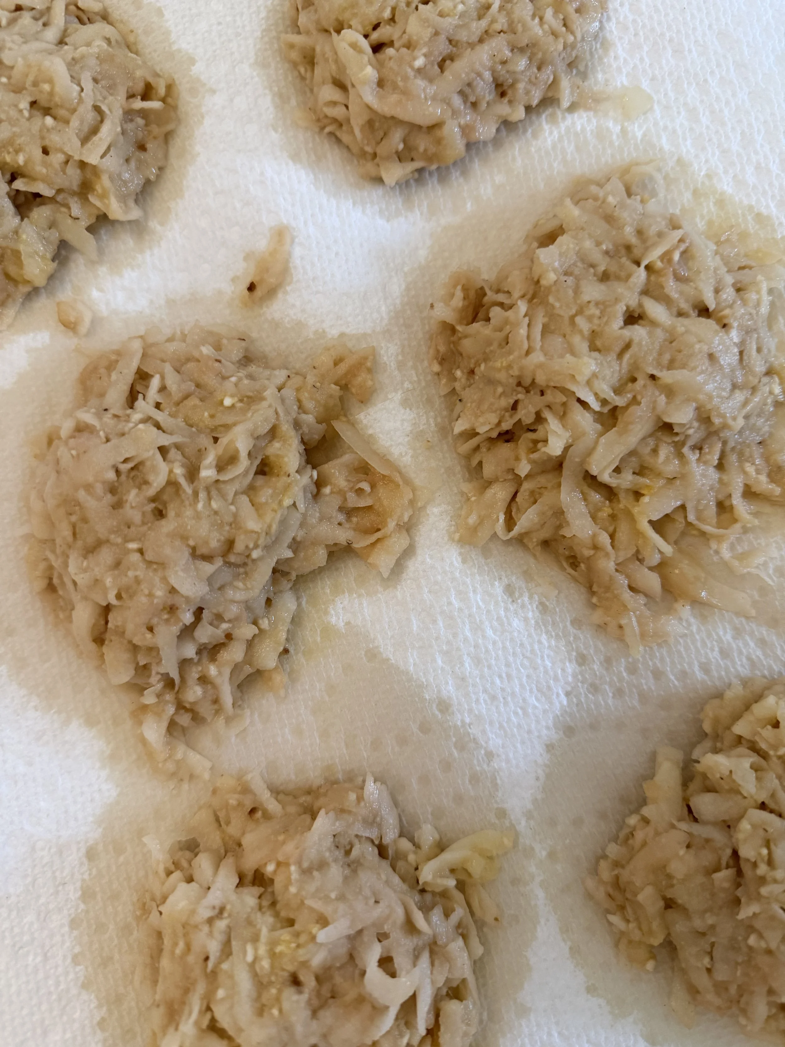 Coarsely grate the potatoes and the onion. Put them in a fine mesh strainer over an empty bowl and press them to remove as much liquid as possible.