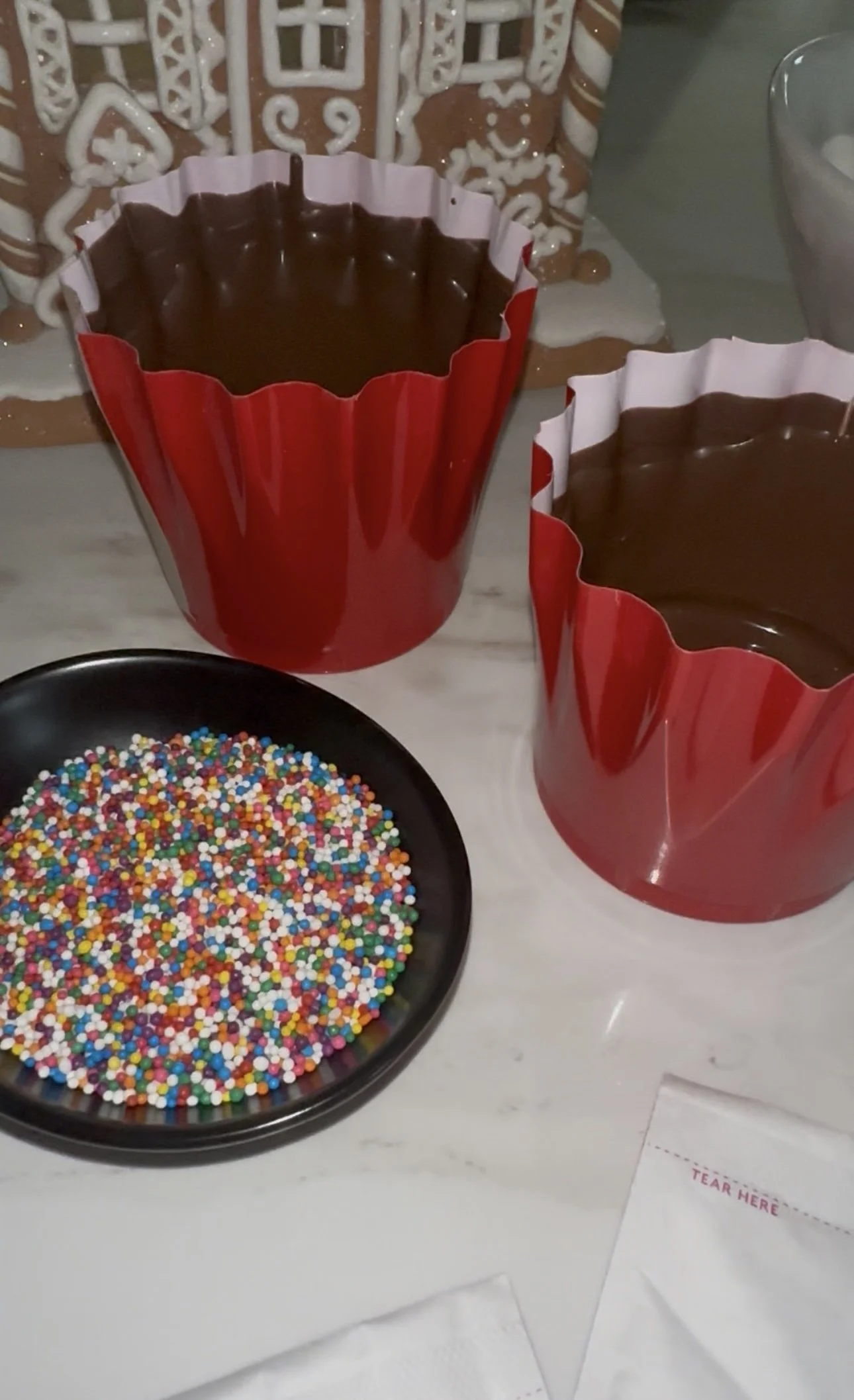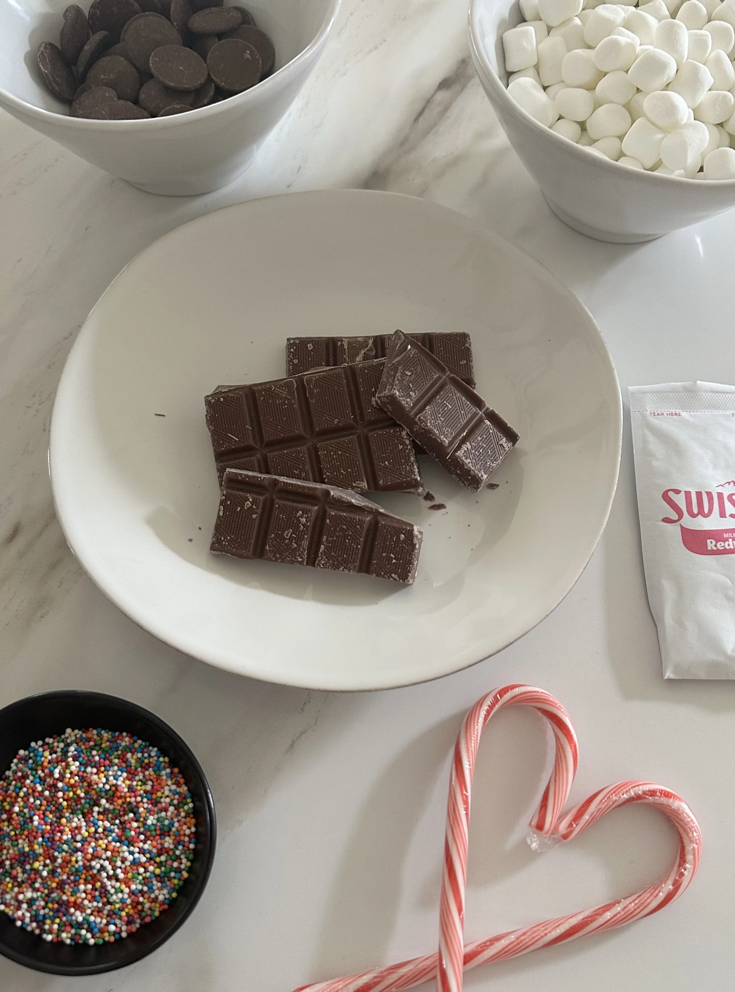 Add in your Candy cane and cover the top of cup with melted chocolate. Top with a handful of marshmallow’s and sprinkles.