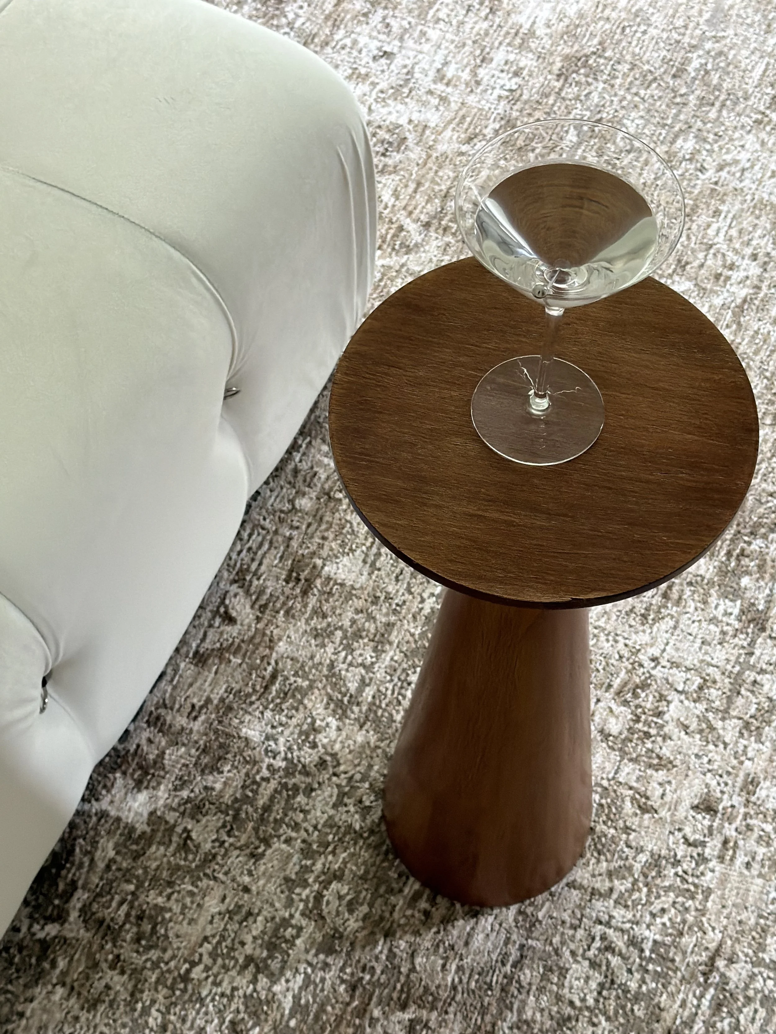 Enter this striking walnut-stained table. It's a study in quiet luxury: a slender base that feels grounded but never heavy, topped with a circular surface that’s perfectly proportioned for a single, martini glass.